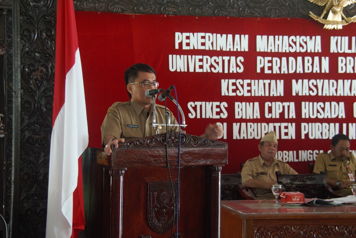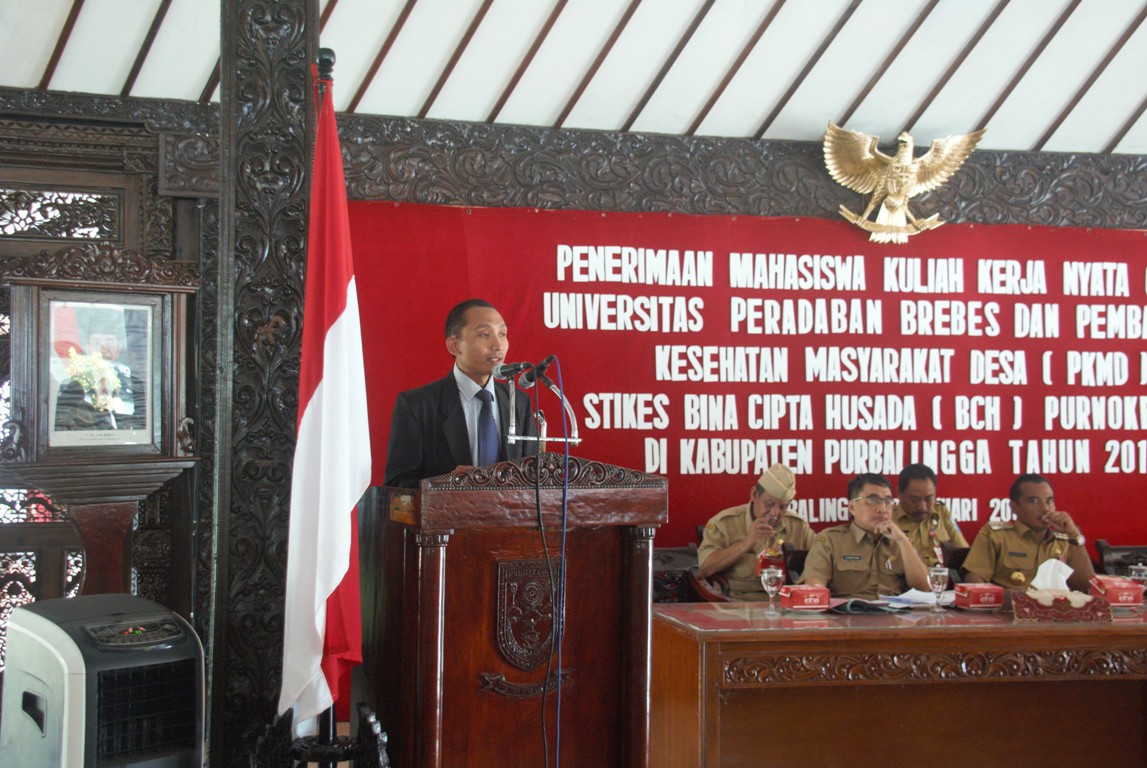 PURBALINGGA, INFO- Pemerintah Kabupaten (Pemkab) Purbalingga tak hentinya menerima mahasiswa Kuliah Kerja Nyata (KKN) dari berbagai Universitas baik negeri maupun swasta. Bupati menyampaikan akan menerima setiap pengembangan Sumber Daya Manusia (SDM) termasuk KKN dari Universitas manapun. Hal tersebut disampaikan Tasdi saat menerima mahasiswa KKN dari Universitas Peradaban Bumiayu Brebes dan Stikes Bina Cipta Husada Senin (29/1) di Pendapa Dipokusumo Purbalingga.